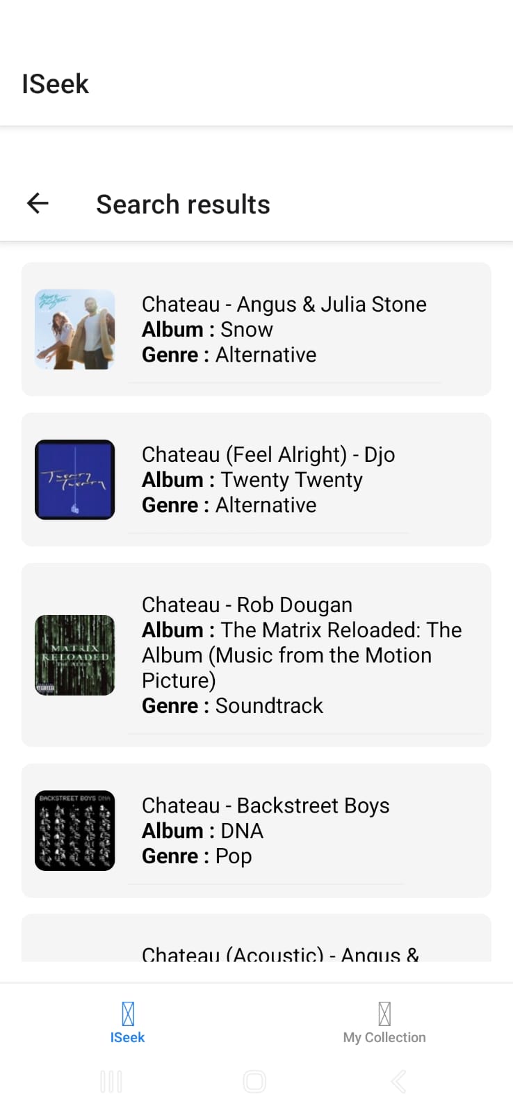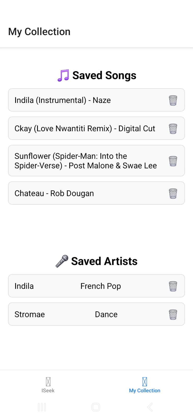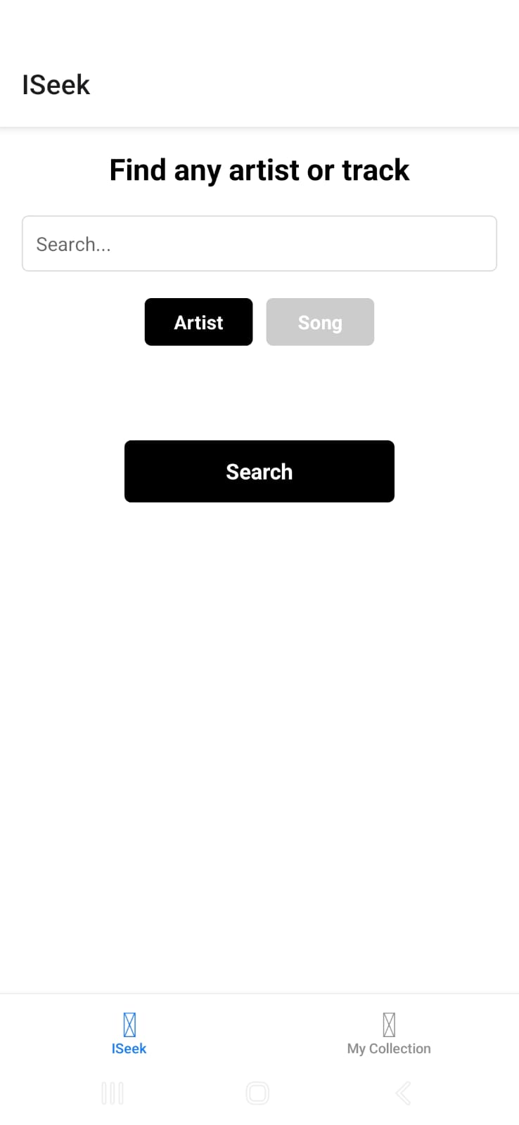 Iseek is a mobile application built with React Native that allows users to search for artists or music tracks via the iTunes API. Users can browse search results, select their favorite items, and save them to a personal collection. The app features a two-tab navigation system: ISeek for searching, and Collection for viewing and managing saved items. The collection is persisted locally using AsyncStorage.